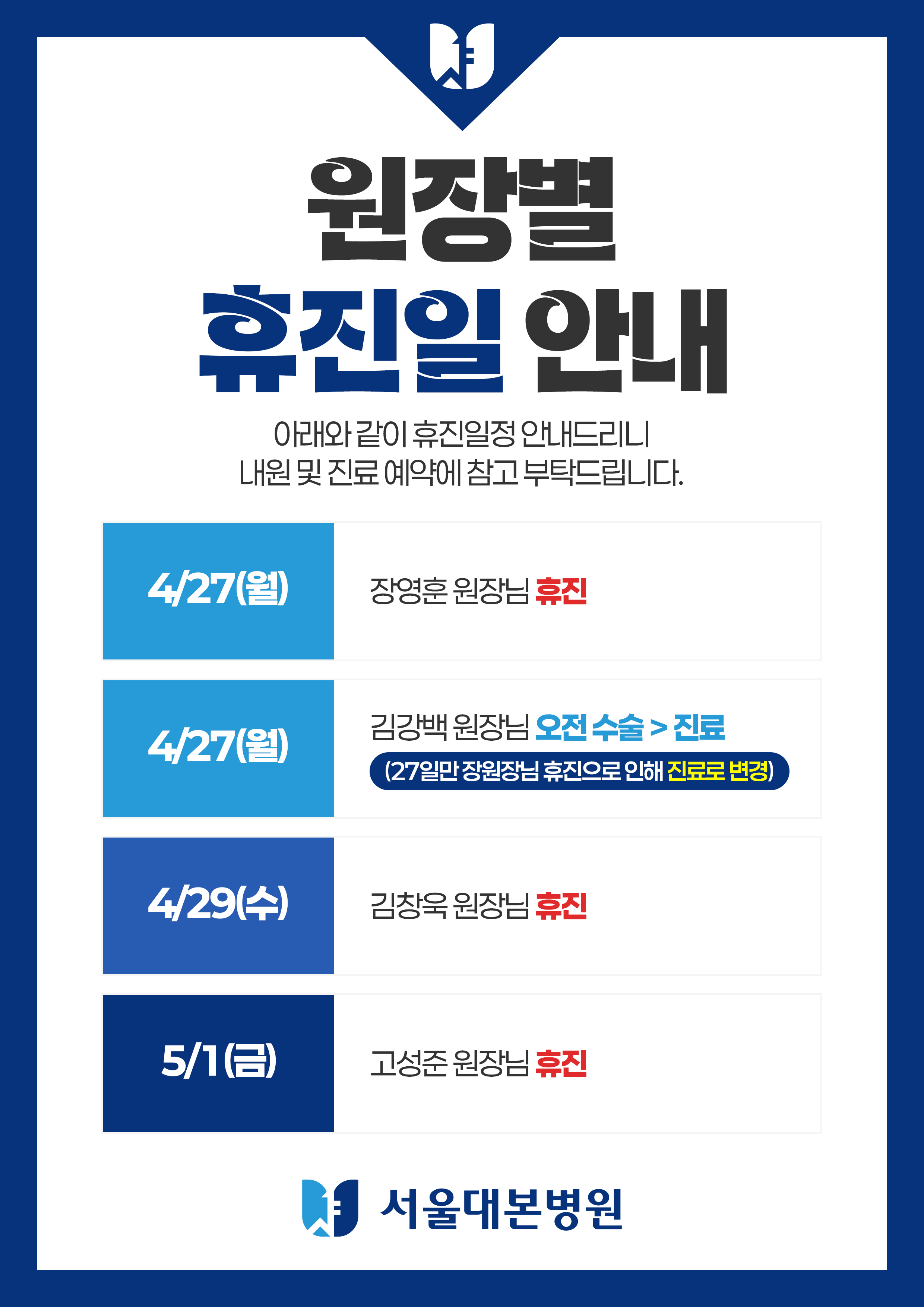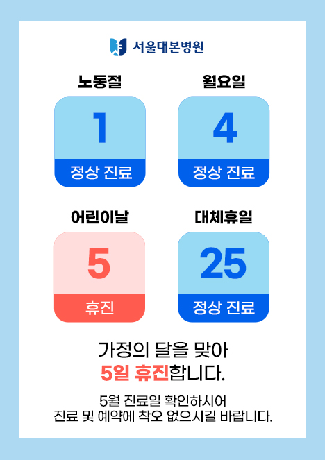 안녕하세요.서울대본병원이 6월부로 일요일 진료를 종료하게 되었습니다.참고하시어 예약 및 내원에 착오 없으시길 바랍니다.※ 6월부터 적용되는 진료 시간 ※평일 : 오전 9시 ~ 오후 6시점심 : 오후 1시 ~오후 2시토요일 : 오전 9시 ~ 오후 1시